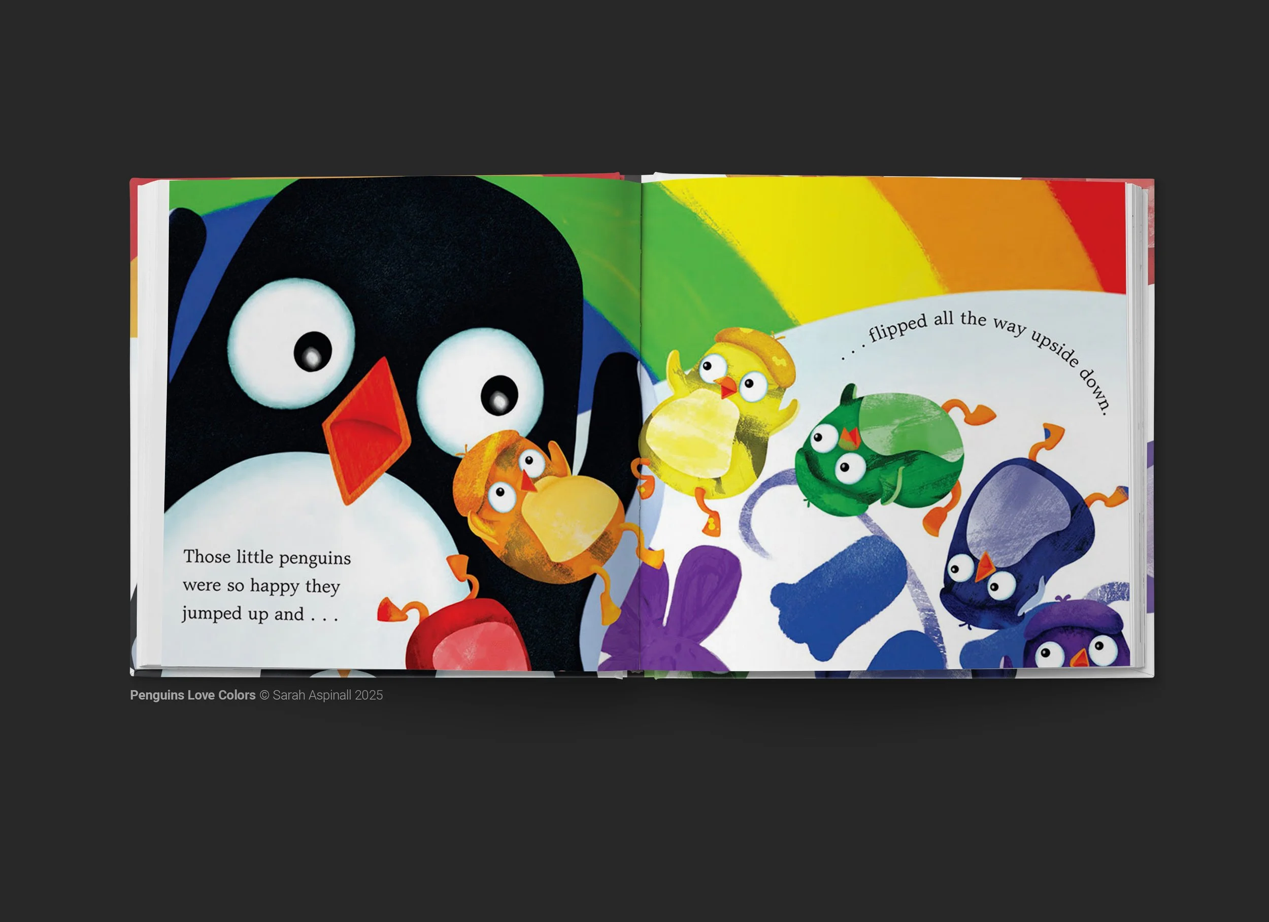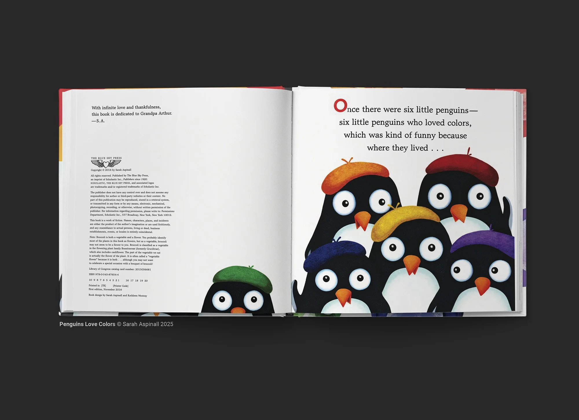Penguins Love Colors, a twice award nominated picture book where Tulip, Tiger Lily, Dandelion, Bluebell, Violet, and Broccoli use red, orange, yellow, blue, purple, and green to color in their snowy world.
